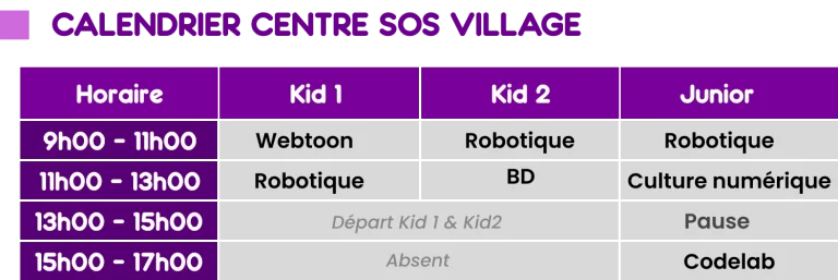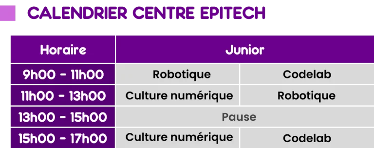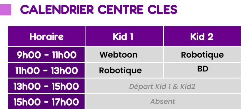Les activités se tiennent généralement de 09h00 à 13h00 (kids 1, kids 2 et Juniors) ou de 14h00 à 17h00 (Juniors en fonction des thématiques), selon le groupe. Un planning détaillé vous sera communiqué prochainement.