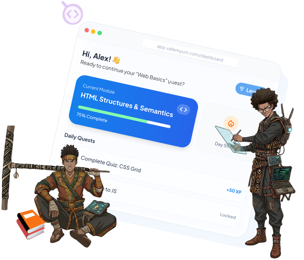 Vallemyↄ est la plateforme d’apprentissage en ligne de la Digital Ninja. Elle allie identité culturelle africaine et innovation technologique pour offrir une expérience immersive unique. À travers des parcours narratifs gamifiés, des quiz interactifs et des défis quotidiens, elle permet aux jeunes Africains de développer leurs compétences numériques, directement depuis chez eux.